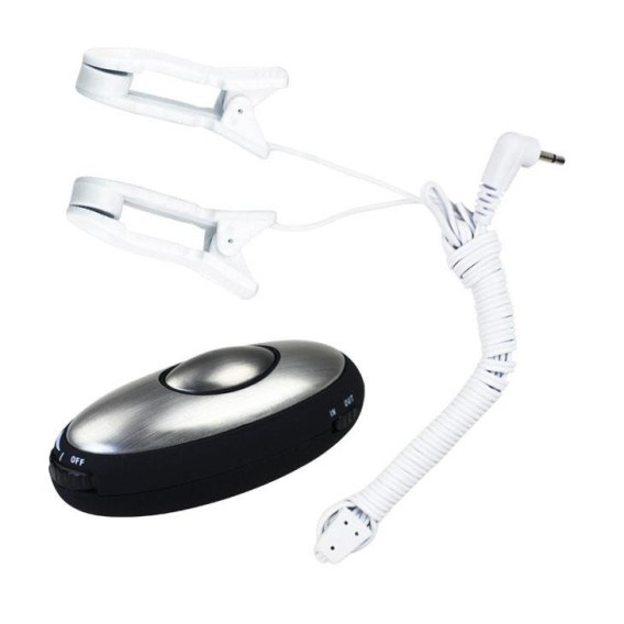 Zestaw zawiera ręczny zasilacz do sterowania stymulacją elektryczną, z parą zacisków na sutki, które są połączone przewodem.