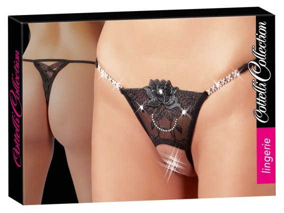 Sexy right down to the last detail!Tiny crotchless string with a seductive open crotch. With elaborate embroidery at the front and rhinestone decoration. With fancy decorative lacing above the buttocks. 100% polyester.