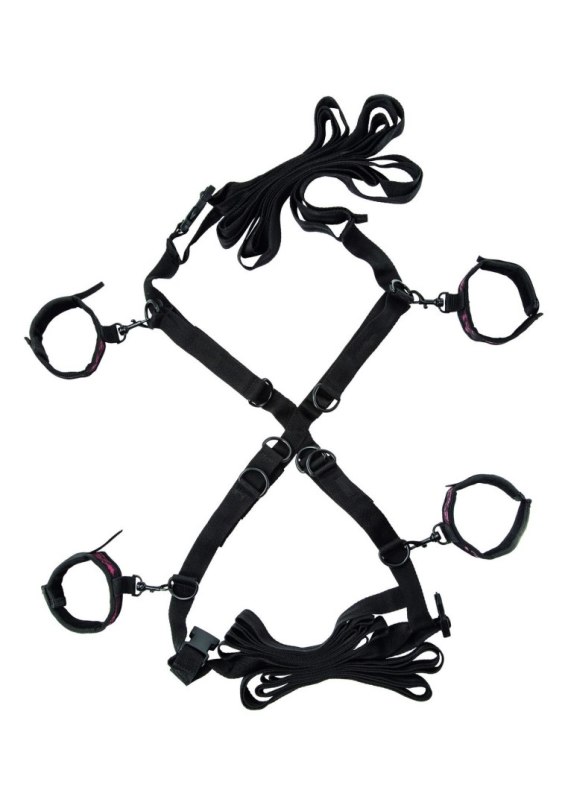 Przypnij mocno swojego kochanka do łóżka i spełnij jego najskrytsze pragnienia dzięki Scandal Over the Bed Cross. Mocne paski są w pełni regulowane, aby pasowały do każdego rozmiaru łóżka. Uniwersalne klamry i pierścienie mają obrotową konstrukcję, dzięki której zmiana pozycji w upale chwili zajmuje kilka sekund. Jako dominujący pokochasz widok swojego partnera rozłożonego na łóżku, całkowicie unieruchomionego przez te niezniszczalne ograniczenia. Twoja uległość będzie mogła patrzeć i jęczeć z pożądania, kiedy całujesz, drażnisz i pieścisz aż do ekstazy. Jako uległy pokochasz pośpiech polegający na zaufaniu partnerowi do robienia dokładnie tego, co mu się podoba i wszystkiego, co doprowadza Cię do szaleństwa. Miękkie, pluszowe mankiety nadgarstka i kostki zapewnią ci wygodne wiązanie, bez względu na to, jak mocno skręcisz i pociągniesz ograniczenia. Krzyżowy krój sprawia, że jesteś całkowicie narażony na podziwiające spojrzenie i pożądliwe dłonie swojego kochanka, co zapewnia najwyższą przyjemność. Twoja dominująca osoba może zacisnąć paski, aby rozłożyć nogi tak daleko od siebie, jak odważysz się odsłonić wszystko i dać im dostęp do wszystkich najbardziej wrażliwych miejsc. Niezwykle seksowna wyprawa do świata odgrywania ról i obiecująca wyjątkowy i niegrzeczny wieczór gry zarówno dla dominującej, jak i uległej strony.